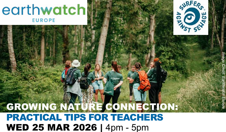 We are so excited to announce our new partnership between Earthwatch Europe and Surfers Against Sewage! With plenty of opportunities to get involved, please join us for our CPD webinar: Growing Nature Connection – Practical Tips for Teachers. Here you can also learn more about upcoming residential teacher training weekend in June 2026... Teach Earth: From Source to Sea. We hope you’ll be as excited as we are! ✨